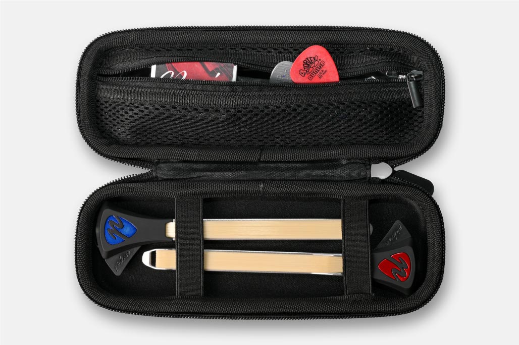 Protect your Pickaso bow with this durable, stylish hard-shell case! Featuring an elegant gray fabric exterior, a padded zipper pocket for all your bow accessories, and room for one or two bows, it's the perfect companion for your musical gear.